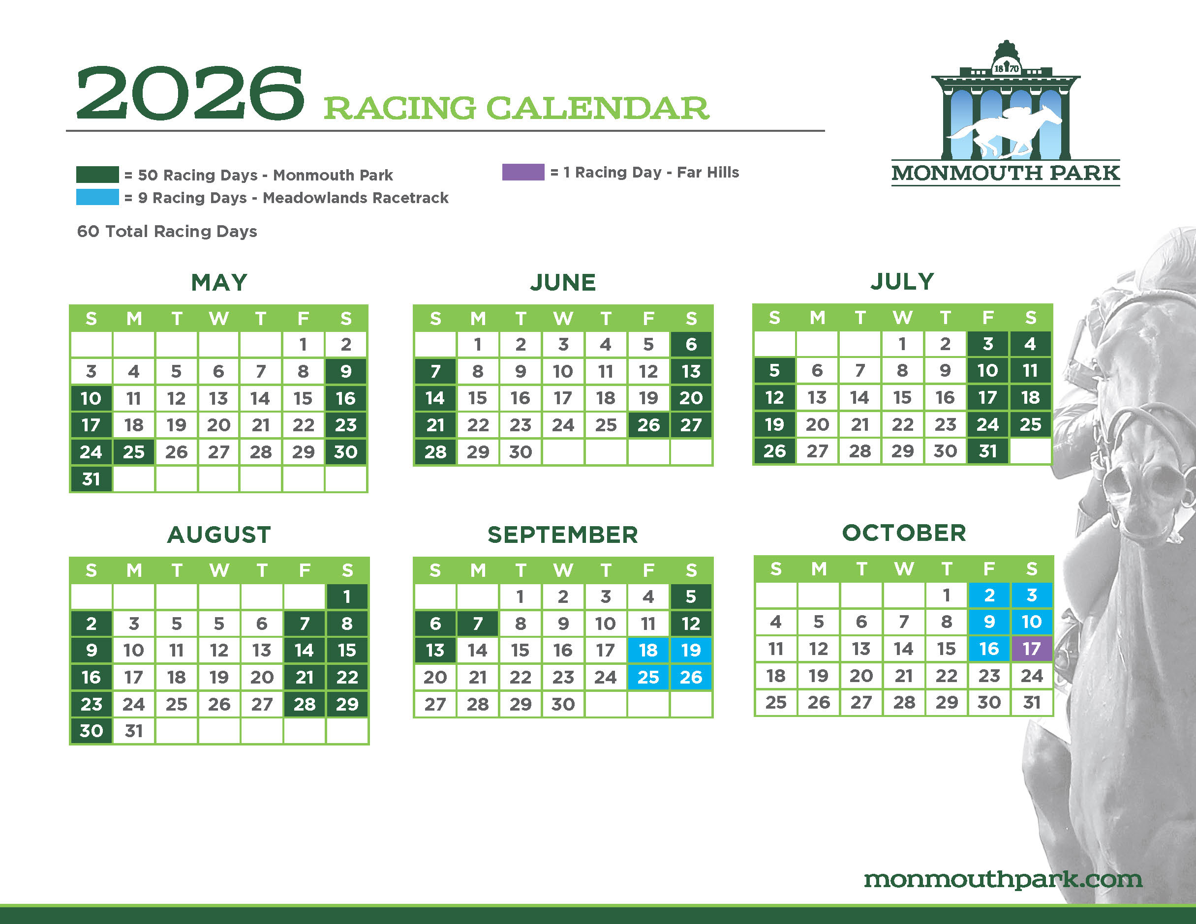 The New Jersey Racing Commission approved the 2026 Thoroughbred Racing Calendar at its November 19, 2025, meeting. Monmouth Park will run 50 days with a nine-day all-turf meet at the Meadowlands.